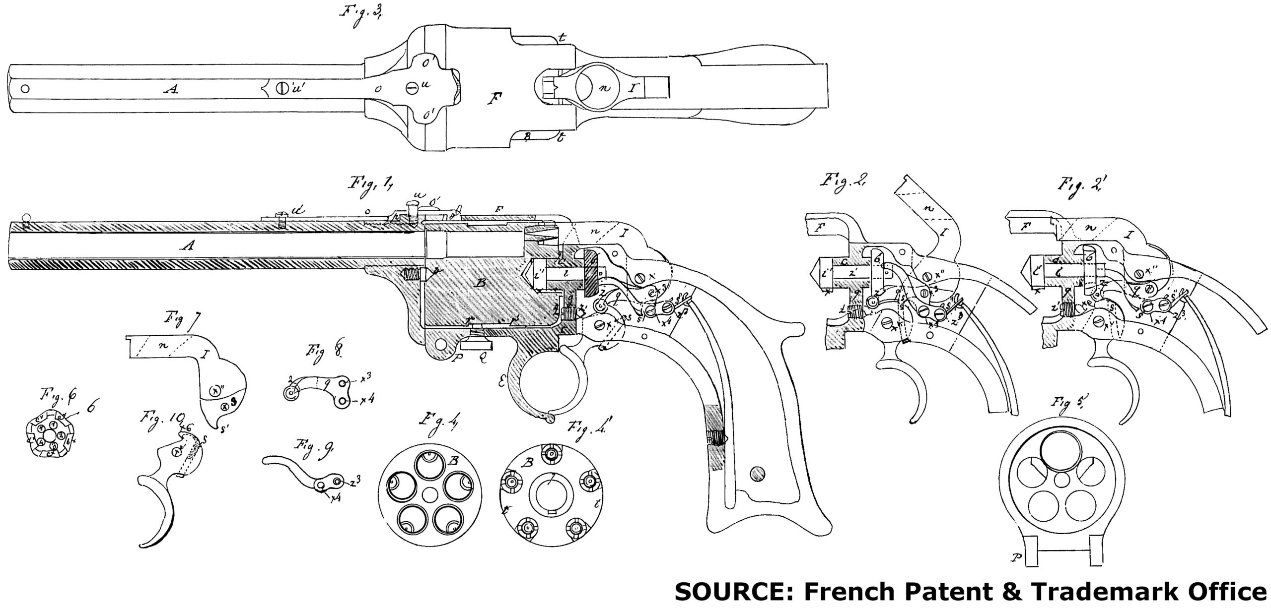 France 39819 (22894) BREVET D’INVENTION DE QUINZE ANS, En date du 9 février 1859, Au sieur PERRIN, à Paris, Pour des perfectionnements apportés aux pistolets-revolvers. Ce qui suit est un certificat d’addition en date du 14 juin 1865, venu après un premier certificat d’addition en date du 9 juillet 1859.…