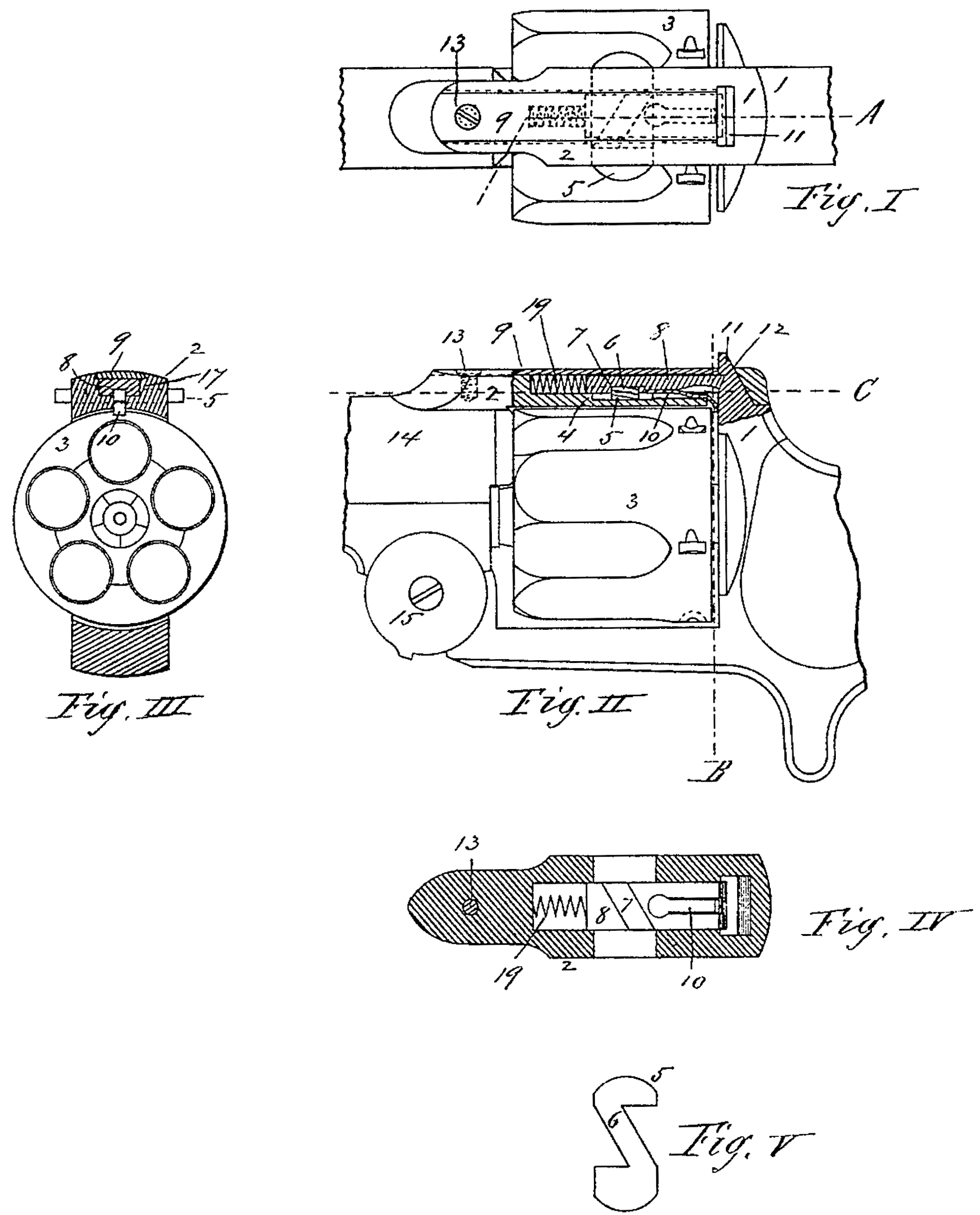 3 represents the cylinder, and 2 represents the top strap, which extends rearward from the barreland above the cylinder, and by which the barrel and cylinder are secured in place against the recoil-plate. In this case this top strap has a longitudinal cavity, as 17, made from its upper side, into which is inserted a sliding latch, as 8, having a cavity or recess, as 7, made obliquely across its lower side, as shown clearly in Fig. IV, and this latch is also recessed for a portion of its length, as shown at 18, to receive a spring or stop, as 10, which, being inserted in place in its recess, may be secured therein by upsetting the metal of the latch against and around it, or by any other suitable means.