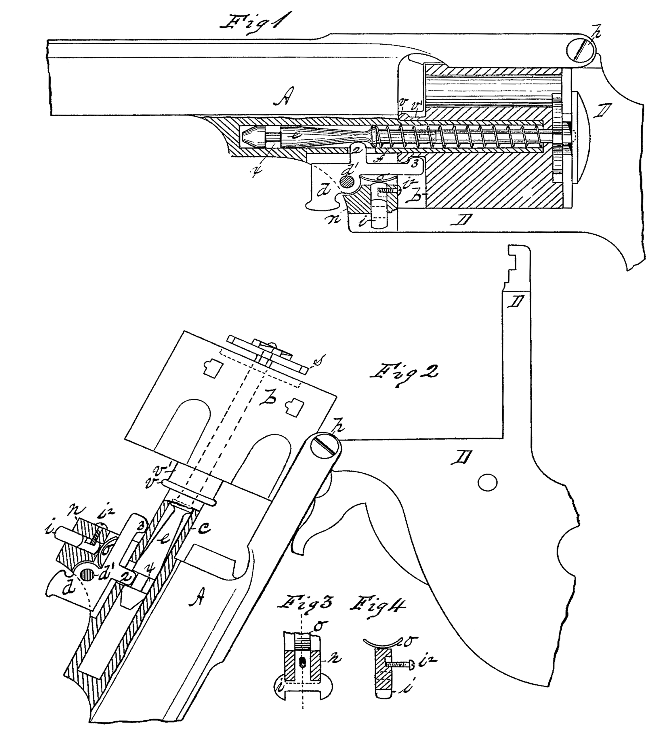 In the arm herein described the barrel and frame are hinged together at h, above and in the rear of the cylinder; and in a down-hanging boss, n, under the bore of the barrel and directly in frame of the cylinder, is placed a vertically-operating barrel-catch, of ordinary construction, whose lower end is driven by spring o into a transverse groove on the arm of frame D, which reaches forward under the cylinder. A stop-screw, i2, in the boss n keeps said catch in its socket in said boss n. The details of the construction of said catch and spring o and their relation to each other are shown in Figs. 3 and 4, and their general relation to frames D and said boss n in Figs. 1 and 2.