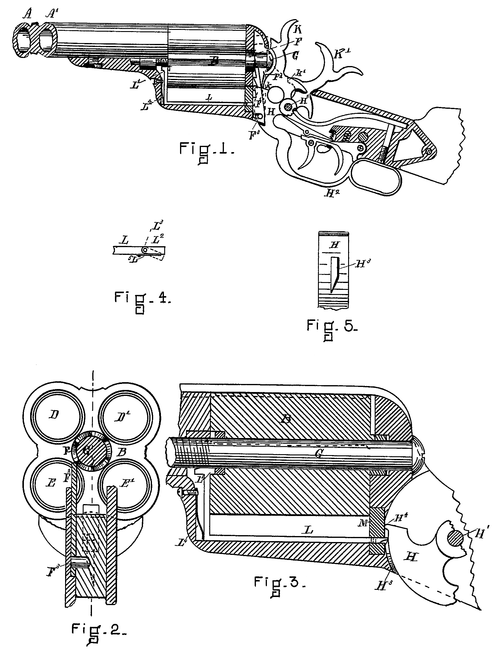 L L’, Figs. 1 and 3, is a bent rod, which serves to lock the charge-chamber block B, the point L’1 entering a recess made in the block B. This rod is thrown so as to engage with the recess by the spring L^4, which is disengaged from the block B by a switch-cam, H^3, Figs. 5 and 3, formed in the guard H, which acts in the following manner: The bent rod L terminates in a swinging switch, L^2, pivoted to it at L, and held in line by a spring, L^5, Fig. 4, so that when the guard H H^2 is thrown down, the switch-cam H^3 comes in contact with LP, and forces L and L^1 forward, so that the point L^1 is disengaged from the charge-chamber block B, thus leaving the block free to be revolved by the pawl F^1. But when the guard H H^2 is brought back the point of the switch-cam H^3 throws the switch L^2 aside, and thus fails to act on the locking device L L^1.