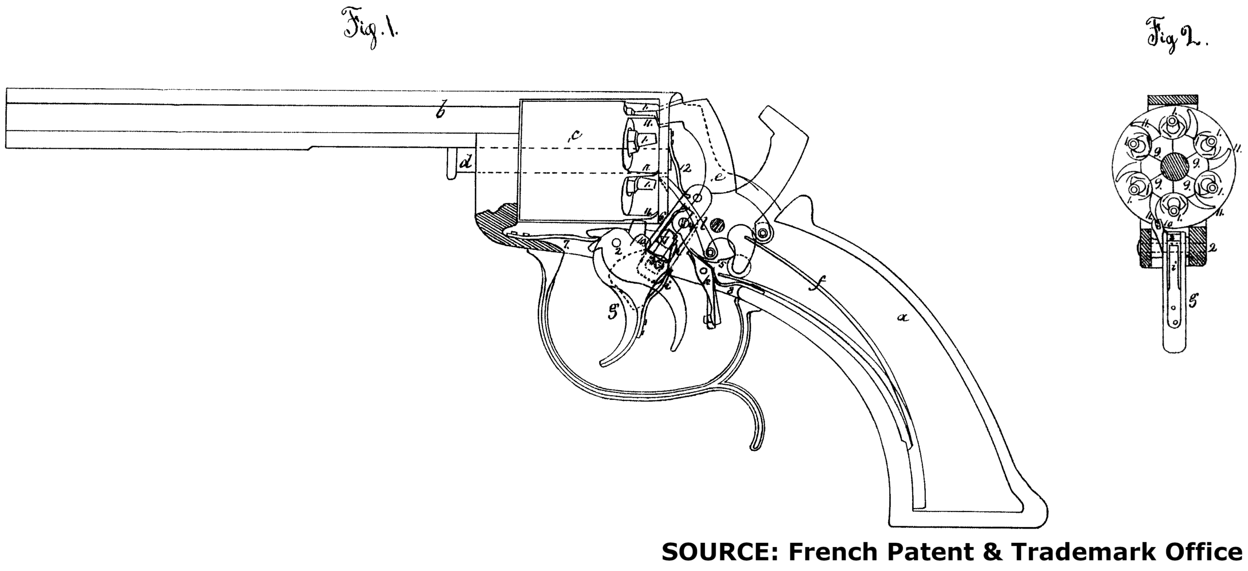Mon invention a pour but de combiner les avantages des deux espèces d’armes à feu, et consiste dans une nouvelle disposition de gâchettes, de chien et de détente, à l’aide desquels le commencement de l’effort exercé sur la détente arme le chien et fait tourner la culasse, puis la détente est dégagée des autres pièces, et donne ainsi du temps pour viser; enfin, en agissant de nouveau sur la détente, on dégage sans effort une autre détente ou une gâchette, et l’on décharge l’arme, et ainsi de suite.