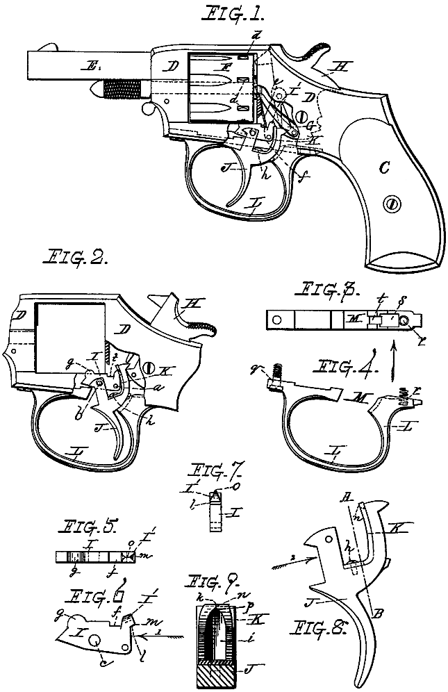The arm may now be discharged by pulling upon trigger J, and after the discharge, as the trigger and its spring are thrown back by the mainspring of the hammer, the pointed end o of projection I’ passes into the apex p of opening or slot i, which forces the two sides of spring K apart and allows the trigger to assume again the position represented in Fig.1.