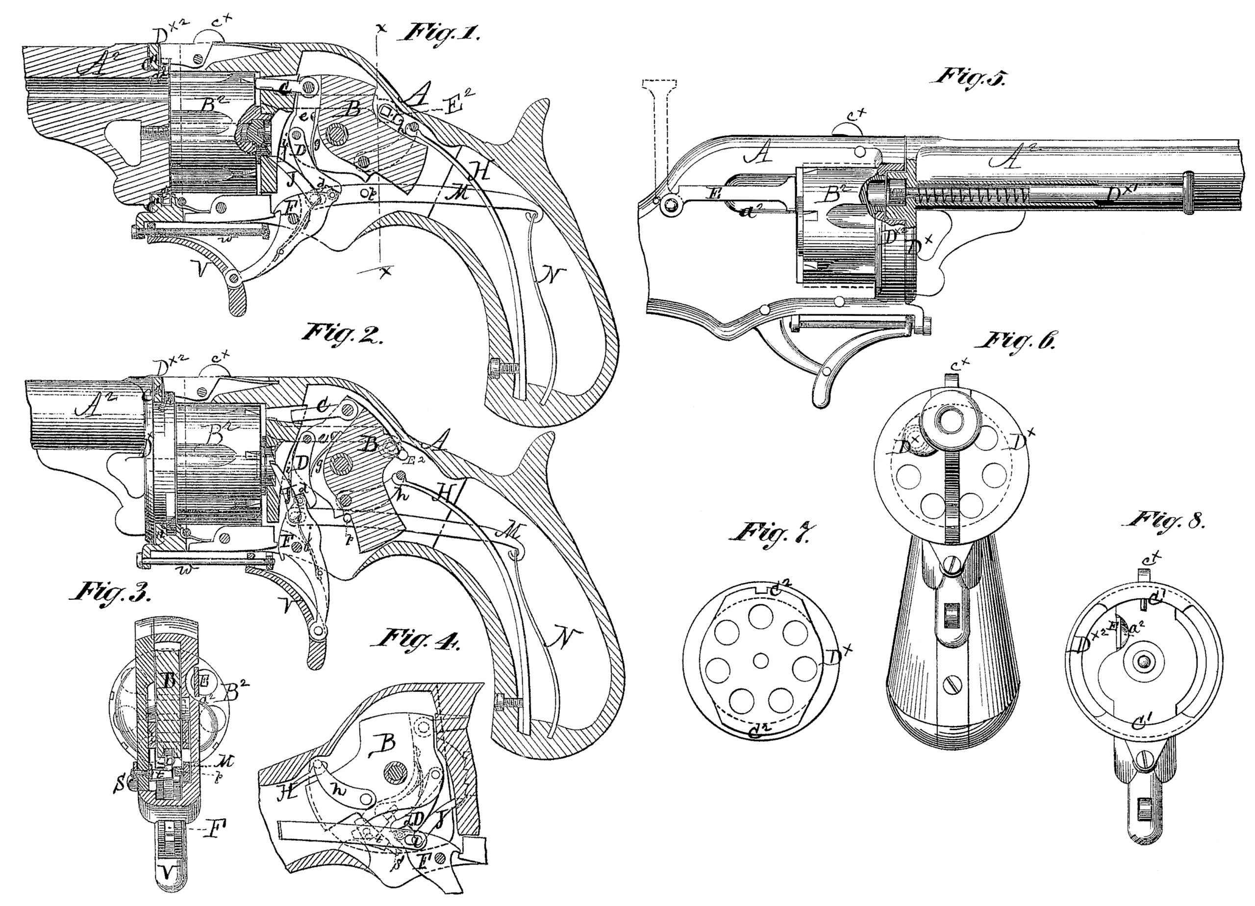 When the cylinder is to be loaded, the bar E is raised to the position shown in dotted lines, causing the lever E^2 to bear upon the heel of the hammer B and depress it, so as to withdraw the firing-pin C. The thumb-piece S is moved up, so as to throw the sear D out of engagement with the trigger. The cylinder is then revolved, by means of the trigger and pawl, so as to bring the chambers successively opposite the recess a^2, and allow the cartridges to be inserted.